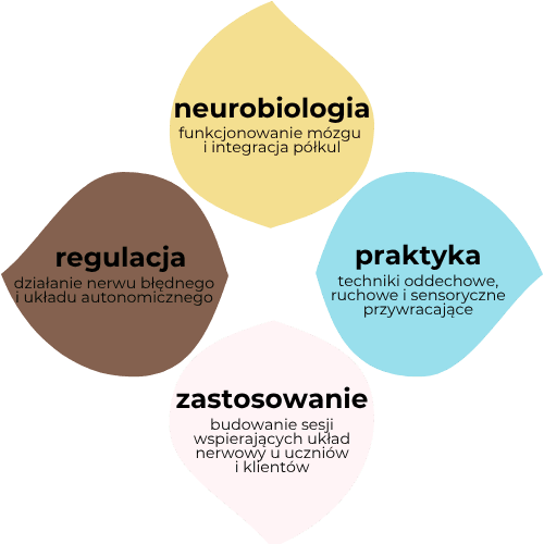 - Otrzymasz 14 godzin edukacji online, łączących neurobiologię, anatomię i praktyczne techniki regulacji układu nerwowego.