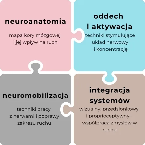 popraw stabilność, równowagę i kontrolę ruchu dzięki technikom neuromobilizacji, oddechu i pracy z receptorami czuciowymi oraz motorycznymi.
