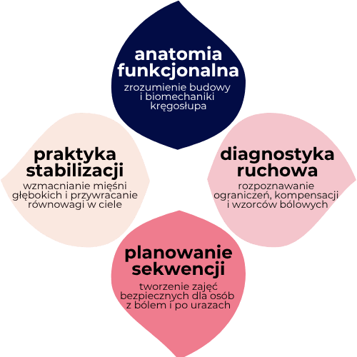 Nauczysz się budować sekwencje skupione na stabilizacji, wzmacnianiu mięśni głębokich i przywracaniu naturalnych zakresów ruchu.