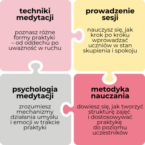 - Zdobędziesz specjalizację z zakresu prowadzenia medytacji, dzięki której poszerzysz swoją ofertę zajęć o elementy pracy z umysłem i emocjami.