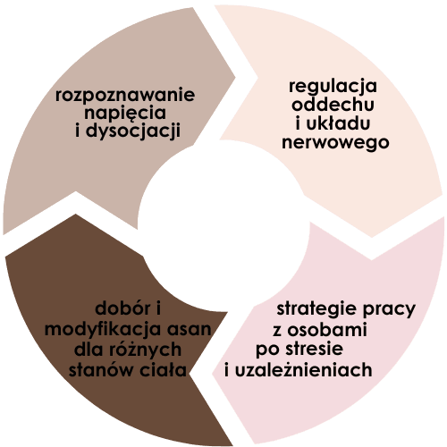 - Zdobędziesz umiejętności prowadzenia zajęć, które wspierają regulację układu nerwowego, redukują napięcie i pomagają odzyskać kontakt z ciałem – dzięki czemu Twoje lekcje staną się bezpieczną przestrzenią dla osób po trudnych doświadczeniach.